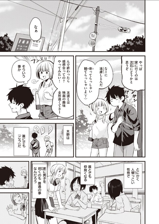 「生で触らせてあげるから、ああいう事もうしちゃダメだよ」休日のレンタルビデオ店でクラスメイトの木野(きの)とバッタリ遭遇し、誘われるまま彼女の家で鑑賞会をすることに。人懐っこくて、バグってて、家に男子を招くなんて当たり前のことなのかもしれないけど……まさか生乳を触らせてくれるなんて!?