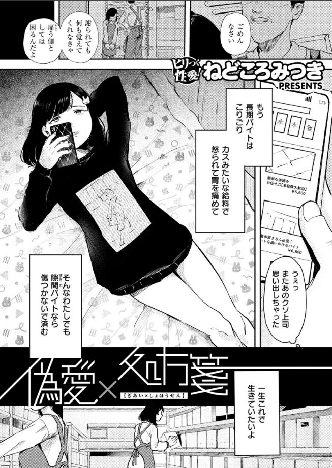 ――この恋は運命だって ちゃんと信じさせて…チャラ男に食われるちょろ女……ねどころみつきがお贈りするヒリつく性愛!!生きるのが下手くそな女のコ、まいちゃんは仕事でもイマイチうまくいかず隙間バイトアプリで食いつないでいる。ある日、派遣先でチャラ上司に食事に誘われたまいちゃん。警戒しながらも、食べ慣れない豪華なお食事やお酒の力でだんだん雰囲気に酔わされて…気づけば終電切れ。「泊まりたいけど…タクシー呼ぶ?」という上司の気遣いに胸がトゥンクしちゃったまいちゃんはそのままホテルへ……。それからというもの、ゴム装着拒否、無許可顔射、首絞め……だんだんエスカレートしていく彼のプレイ。やり放題やられちゃってるまいちゃんだけど、一回好きになっちゃうと頭の中は恋愛ポエムでいっぱい。このコ、この先どうなっちゃうの……?