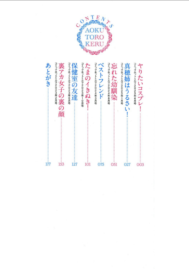 夜な夜なオナニーのおかずにするほど激推しのエロゲのキャラに瓜二つな転校生と出会ってしまったJK『ヤりたいコスプレ!』いとこ・真穂姉がしばらく居候することになったけど、彼女の無防備エロが気になって落ち着かない『真穂姉はうるさい!』ネトゲ仲間の家に行ったら、実はかわいい女の子だった。しかもハードディスクには彼女のハメ撮り画像だらけ!『ベストフレンド』性に奔放?それともビッチ?いいえ、きっと彼女は「好き」にまっすぐなだけ股間と脳みそ直撃のストーリー&濃密プレイ Z世代の描くエロ漫画、ここに登場!<収録作品>ヤりたいコスプレ!/真穂姉はうるさい!/忘れた幼馴染/ベストフレンド/たまのイきぬき!/保健室の友達/裏あか女子の裏の顔