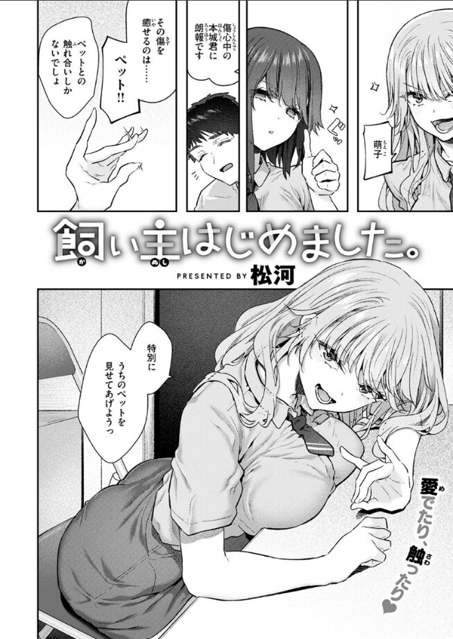 「特別にウチのペットを見せてあげる♪」意気消沈の本城(ほんじょう)くんはかわいい子犬をお迎えするためにバイト代を貯めていたものの、一足遅く他の人に貰われてしまったらしい。用意した資金はなんと50万円。その事を知ったバイト仲間の巨乳ギャル2人・村上(むらかみ)と白川(しらかわ)は、本城くんを癒すための《とある作戦》を思いつき……♪乱交の名手、松河描くケモミミナースなコスエッチ3P♪